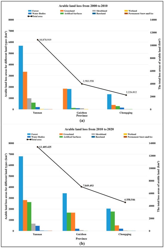 From 2000 to 2010, the total area of arable land lost in the region was 17,081.289. Among the three provinces, Yunnan had the largest area of loss, reaching 10,870.919, which accounted for approximately 64% of the total loss area in the three provinces (Figure 4a). However, the areas of loss in Chongqing and Guizhou were relatively small, accounting for only about 13% and 23%, respectively. The data presented in Figure 4b illustrates that from 2010 to 2020, the total area of arable land lost in the region was 25,013.464, which represented a 46.43% increase compared with the previous decade. This indicates that the situation of arable land loss in the region continuously deteriorated. Upon examining the situation in each province, it is evident that the loss of arable land deteriorated to varying degrees. Among them, Chongqing and Guizhou had a greater degree of deterioration, with increases of 104.71% and 76.94%, respectively. However, Yunnan Province still had the highest rate of arable land loss, with a total loss area of 13,405.425, which exceeded the combined loss area of arable land in Chongqing and Guizhou. From the perspective of where arable land was lost, forest and grassland are still the two most significant destinations for loss. However, unlike before, the area of arable land converted into artificial surfaces significantly increased, becoming another major destination of loss. This indicates that over the past decade, numerous human activities in the region led to the destruction of arable land. Furthermore, in Chongqing, there was a conversion of arable land to bare land.