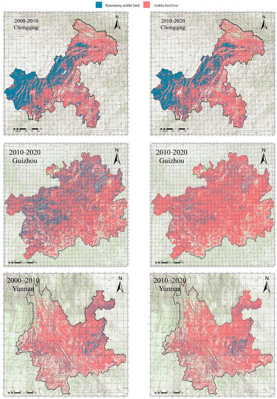 Figure 5 illustrates the overall trend in arable land changes in the study area. A comparison across different time periods reveals that although the general land use of arable land remained relatively stable, starting in 2010, the loss of arable land around major urban centers expanded significantly, leading to a gradual reduction in arable land area. For instance, in the southwestern urban core of Chongqing and the central–western region of Kunming in Yunnan Province, both the blank and red areas increased, indicating a reduction in arable land and an intensifying loss and loss of arable land around urban areas. In contrast, the changes in Guizhou Province were more dispersed. While the total amount of arable land remained relatively stable, the significant expansion of red areas suggests that arable land loss worsened, and substantial changes occurred in certain regions. Furthermore, the blue areas, representing an increase in arable land, showed little spatial variation between the two periods, remaining primarily in densely populated, flat regions. This indicates that the spatial pattern of arable land in these areas remained relatively stable.