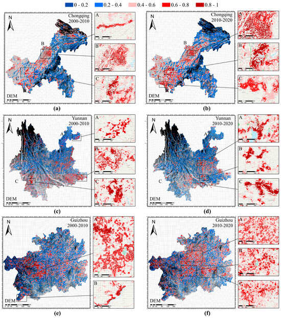 From 2010 to 2020, the phenomenon of spatial agglomeration became more prominent. There were no significant changes in the location of agglomeration in Chongqing, except for the exclusion of Yunyang County and the inclusion of the area of Jiangjin District that borders Sichuan Province (Figure 6d(C)), while the main urban area presented a more striking agglomerating phenomenon around Yuzhong District (Figure 6d(B)). In Yunnan and Guizhou, on the other hand, the locations of the agglomerations changed to varying degrees. Yunnan underwent considerable changes, with its agglomerating locations now located in the middle and south of Kunming and Honghe Hani and Yi Autonomous Prefecture (Figure 6e). In contrast, the change in Guizhou was relatively slight, and its spatial distribution was still scattered, but its agglomeration phenomenon strengthened compared with the previous one, which was mainly concentrated in the surrounding cities centered on Guiyang, such as the southern part of Zunyi (Figure 6f(A)), Qianxi City (Figure 6f(B)), and Qiandongnan Miao and Dong Autonomous Prefecture (Figure 6f(C)).