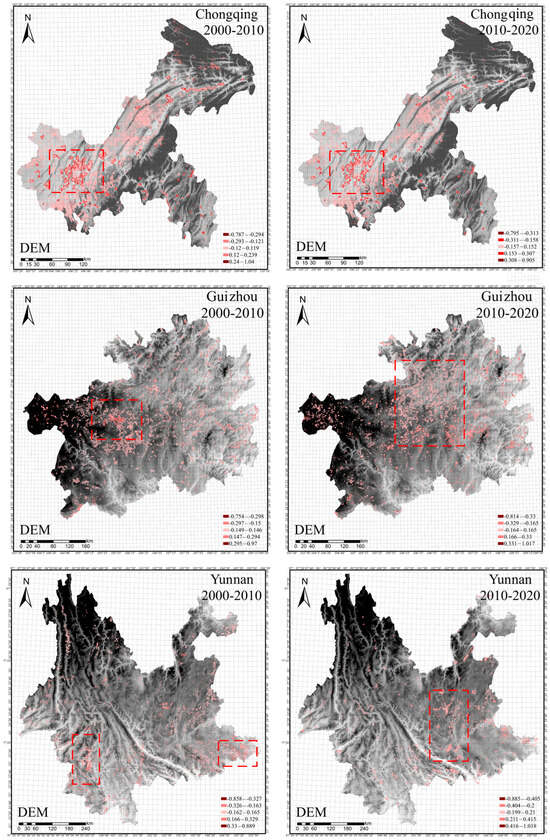 By comparing the spatial distribution of high residuals across the three provinces during the two time periods illustrated in Figure 7, we discerned variations in the distribution of model’s residual within localized regions of each province. This was accomplished by observing the red dotted line box in the figure and then deriving the change trend and degree of model performance in each province. In Chongqing, the spatial distribution of high residuals remained consistent, mainly concentrated in the main urban areas. The maximum and minimum values of the change amount were −0.135 and −0.008, respectively, suggesting the overall improvement of the model. In Guizhou, the dispersion of high residuals was more pronounced in the 2010–2020 period compared with the 2000–2010 period. The maximum and minimum values had a variation of 0.047 and −0.06, respectively, which suggests that the variability among localized regions may have been enhanced by changes in data quality or new influencing factors. However, there was no significant change in the overall performance of the model. In Yunnan, during 2000–2010, high residuals were concentrated in the southwest and southeast regions; however, in the 2010–2020 period, the distribution shifted to the central region. Meanwhile, the change in the maximum and minimum values of the residuals was 0.129 and −0.027, respectively. These changes indicate that the regional specificity of the central Yunnan region was stronger during this period and the overall performance of the model decreased. Overall, the distribution of residuals showed spatial clustering, and the overall performance of the model was stable.
