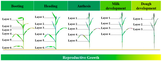 The chlorophyll variables at the different leaf layers were measured using field sampling and subsequent laboratory analysis. At each growth stage, three wheat plants were sampled randomly for each treatment, and each leaf of the sampled plants was measured to determine the chlorophyll content. Leaves were collected from different vertical layers, denoted as layer one (L1), two (L2), three (L3), four (L4), five (L5) and six (L6), spanning from the top to the bottom of the canopy (Figure 1). The height of each leaf layer was measured synchronously, representing the distance from the position of the leaf collar to the ground.