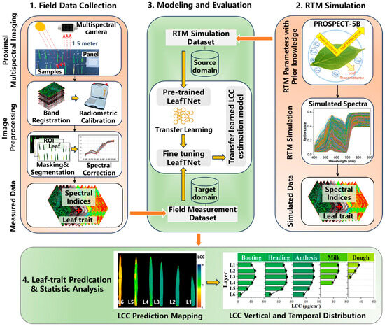 By integrating the advantages of deep learning and physical radiative transfer simulations, LeafTNet proves highly effective in remote-based leaf trait retrieval. The LeafTNet achieved notable accuracy in leaf-scale LCC estimation, outperforming traditional empirical statistics and machine learning methods that rely solely on field-measured information. Moreover, the model’s application for LCC prediction in 2023 also performed effectively in the corresponding stages in 2024. Overall, LeafTNet demonstrated robust performance and generalizability in LCC estimation of winter wheat leaves from proximal multispectral imagery. This study offers technical support for predicting the vertical LCC distribution of winter wheat leaves and provides some insights for studying the relationships between the vertical heterogeneity of leaf traits and the optimization of agricultural practices.