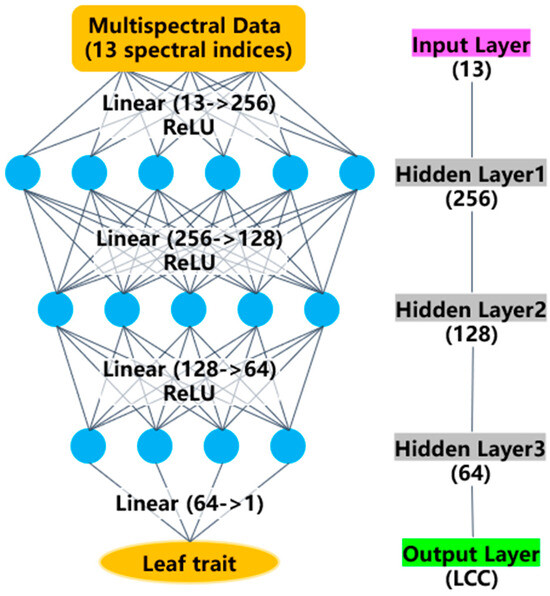 Spectral variables and leaf traits exhibited complex relationships, involving multicollinearity and data redundance. Deep learning uses multiple hidden layers for feature extraction. A deep neural network was developed in this study using a four-layer fully connected tapering network architecture to analyze the 1D spectral data (Figure 3). Each layer employed the linear transformation. Subsequently, introducing nonlinearity with the Rectified Linear Unit (ReLU) activation function to each hidden layer, enabling the network to learn and represent complex nonlinear relationships. The final output layer omitted ReLU to maintain continuous output values suitable for the regression task. The hidden units were configured in descending order as 256, 128, and 64, which facilitates progressive feature compression and reduces reliance on noisy or irrelevant features. The tapering network architecture in deep neural networks gradually compresses low-level features into higher-level abstract features, thereby reducing redundant information and extracting more meaningful feature representations. By limiting the capacity of subsequent layers (with fewer nodes), the network selectively preserves and transmits the most important information, which helps to reduce the complexity of the model, lower computational complexity, thereby reducing the risk of overfitting.