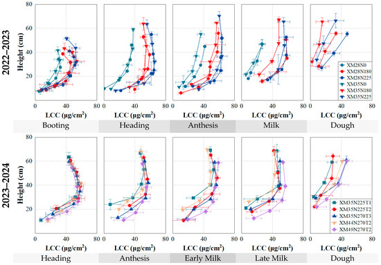 Vertical profile of chlorophyll variables of winter wheat within different canopies during the two growth seasons, and five growth stages for per season. The data were collected from two wheat varieties (XM35 and XM28) under three N fertilization treatments (N0, N180 and N225 kg N/ha) in 2022–2023, while three wheat varieties (XM35, XM44 and XM49) under two N fertilization treatments (N225 and N270 kg N/ha) in 2023–2024. Each point represents the average LCC values of three replicated samples in each treatment. The y-axis shows the height of their leaf collar above the ground. Error bars indicate standard deviation.