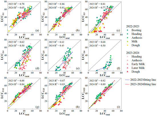 Relationship between the LCCtotal and the LCCLi (a–f); LCCUi (g–i) across the entire growth season. LCCUi involves multi-layer LCCLi, e.g., LCCU12 refers to the LCC of leaf layers L1 and L2.