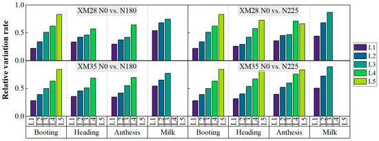 Relative variation rate of the LCCLi in response to different N rates in different growth stages (2023). The relative variation rate is the product of the LCCLi under high-nitrogen treatment minus the LCCLi under low-nitrogen treatment, and then divided by the LCCLi under high-nitrogen treatment.