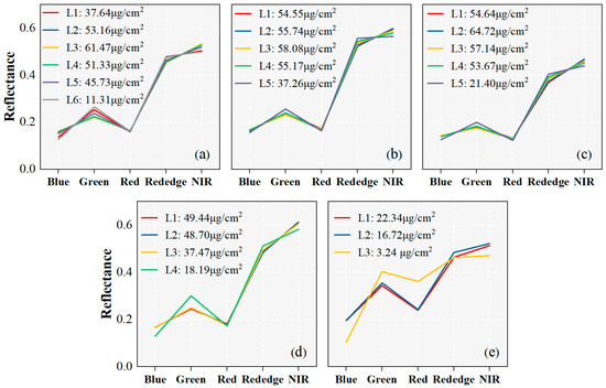 Spectral reflectance curves for leaves at different vertical layers within the canopies under the N180 fertilization level: (a) the booting, (b) heading, (c) anthesis, (d) milk and (e) dough stage.