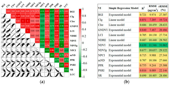 Relationship between LCC and the vegetation indices (VIs) throughout the entire growth season. (a) The scatter plots in the bottom left area depict the relationship between VIs and LCC, the top right area shows the corresponding heatmap on Pearson correlation coefficient. (b) The performance of vegetation indices’ sensitivity to LCC. ‘Exponential model’ involves exponential function eax+b.