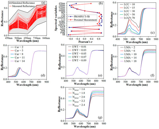 (a) Leaf multispectral reflectance of winter wheat from PORSPECT-5B simulations and proximal multispectral measurements. Shadows indicate the range of simulated reflectance. (b) Pearson’s correlation analysis between LCC and spectral variables from the simulated and measured data respectively. Sensitivity analysis of leaf reflectance at 400–900 nm to the variations in PROSPECT-5B model parameters: (c) leaf chlorophyll content (LCC, μg/cm2), (d) leaf carotenoid content (Car, μg/cm2), (e) leaf equivalent water thickness (EWT, cm), (f) leaf mass per area (LMA, mg/cm2), and (g) leaf structure index (Nstruct).