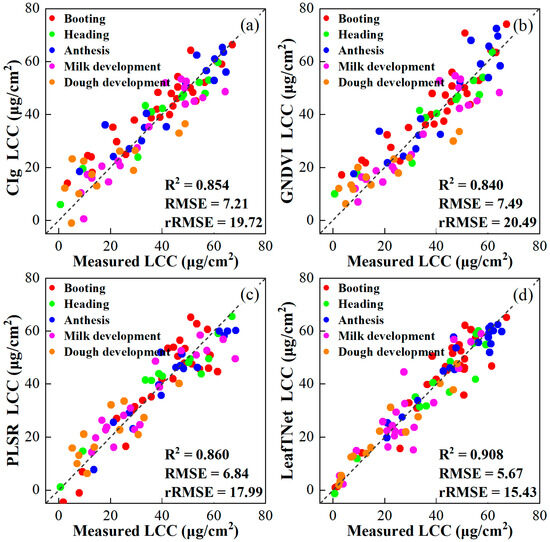 Figure 8a shows the relationship between LCC and thirteen vegetation indices throughout the entire growth season. As shown in the scatter plot in the lower left of the figure, the relationship between vegetation indices and LCC can be divided into two types: linear and nonlinear. Therefore, the linear and nonlinear models of VI-LCC can be constructed using the least squares method and generalized linear model with a Poisson distribution term, respectively. We used the thirteen vegetation indices to establish the inversion model for LCC over the entire growth season. The results of thirteen VI models are shown in Figure 8b. The findings demonstrated a relatively significant linear connection between LCC and several widely used VIs, such as the Chlorophyll Index using Green Reflectance (CIg), with R2 of 0.851. However, the Chlorophyll Index using Red Edge Reflectance (CIre, R2 = 0.686) and the Normalized Difference Vegetation Index (NDRE, R2 = 0.687) did not fare as well. Moreover, a relatively strong nonlinear correlation was found between LCC and several widely used VIs, such as the Green NDVI (GNDVI) and Plant Senescence Reflectance Index (PSRI) (R2 for GNDVI was 0.840, R2 for PSRI was 0.816). These VIs were derived from a combination of blue, green, and near-infrared (NIR) bands, suggesting that those bands had a decent capacity to estimate LCC under relatively complex conditions. These findings indicated that the spectral band combination of the blue, green and NIR bands derived from the broadband multispectral reflectance was crucial for LCC estimation.