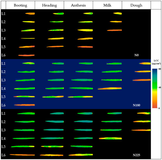Despite the surging interest in the role of chlorophyll status in crops, most studies have been conducted on the spectra–trait relationship for sunlit leaves at the upper layer within the canopy, the vertical variability of chlorophyll has been neglected in studies using canopy spectral reflectance measured by satellites or drone-based remote sensing [20,21,22,23]. In these studies, the entire canopy was considered as a homogenous plane, which limits robustness of canopy remote sensing and reduces it the practical value. The possible reasons for the limited or lack of studies thereof are the insufficient and complex collection of field measurements data at different leaf layers within the canopies [20] and the lack of effective observation methods based on remote sensing to characterize the vertical heterogeneity in leaf traits and spectra. Extensive evidence suggests that chlorophyll content in flag leaves at the jointing and filling stages and three upper layer leaves at the booting and anthesis stages are commonly used to assess canopy chlorophyll status [16,23], whereas other studies indicated that middle layer leaves at anthesis stage are more suitable as indicators for canopy chlorophyll diagnosis [24,25]. There is controversy over the effective leaf layers that represent canopy chlorophyll status during various growth stages. In addition, some reports indicated that nitrogen fertilization application in wheat plants influenced vertical LCC distribution, as crops respond to nitrogen stress by altering chlorophyll content in different vertical leaf layers to maintain photosynthetic efficiency [10,26]. However, to date, few studies have conducted sufficient multi-temporal observations to analyze the characteristics of vertical LCC distribution in winter wheat under different nitrogen treatments in a systematic manner and construct a quantitative model to reveal the intrinsic mechanism between LCC and leaf spectral imaging reflectance at a fine scale.
