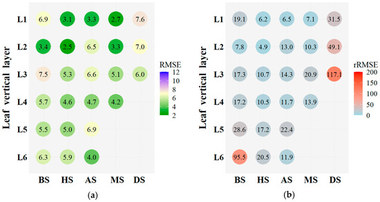 The (a) RMSE (μg/cm2) and (b) rRMSE (%) of LeafTNet model in various vertical layers through different growth stages. The x-axis represents the growth stage of winter wheat, and the y-axis represents the vertical layer within the canopy (L1–L6 from the top to the bottom layer within the canopy).