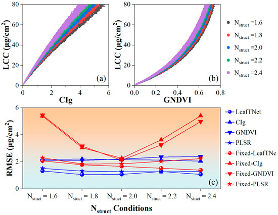 (a,b) are the relationships between VIs-LCC under different Nstruct conditions. (c) is the accuracy of winter wheat LCC validation results under different Nstruct conditions. Red lines refer to the fixed model trained from the mixed Nstruct conditions; blue lines refer to the model trained from specific Nstruct condition.