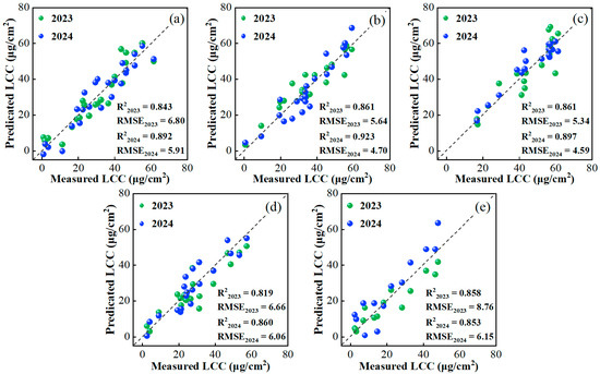 Scatter plots of predicated and measured LCC in 2024 derived from the LeafTNet model established by the PROSPECT simulation dataset and finetuned by field-measured data in 2023 and 2024, respectively. (a–e) are the LCC validation results of heading, anthesis, early milk development, late milk development, and dough development stage in 2024, respectively.