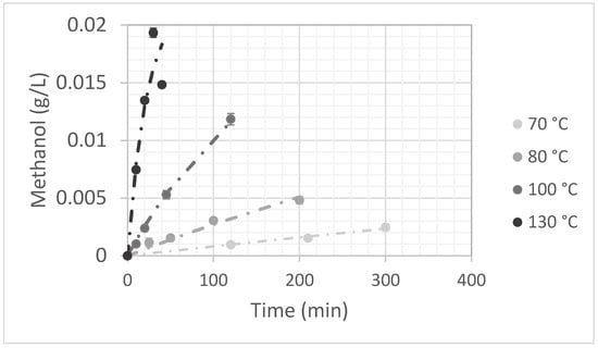 Generally, the methanol increased as a function of time under all assessed temperatures (Figure 2). The concentration of methanol released from the pectin structure increased slightly during heating for up to 300 min when the model medium was heated at 70 °C. There was a steady increase in methanol in the model medium heated at 80 °C for up to 200 min, whereas heating at temperatures ≥ 100 °C led to a faster and higher release of methanol with a trend of continued increase. The temperature of 130 °C provided the highest concentration of methanol in the shortest time: 40 min. By monitoring the presented graph, the assumption was that longer treatments would release a higher concentration of methanol at this temperature.