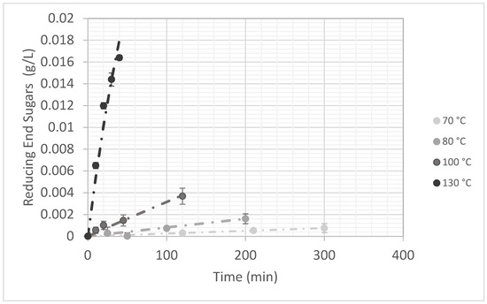 When heated, reducing end sugars increased in okra pectin solutions as a product of pectin hydrolysis (Figure 3). The more the temperature increased, the more the rate constant of the reaction increased. As for methanol release, galactose equivalent production was well represented by a one-order model (R2 = 0.88–0.97). The rate constants are presented in Table 3.