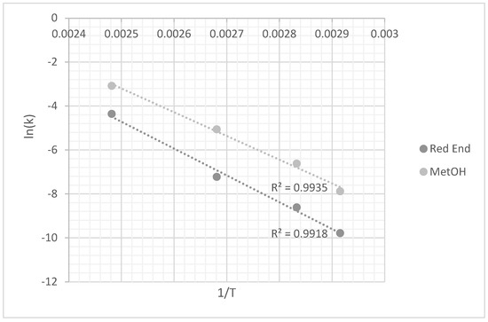 Rate constants (dots) of methanol and reducing end sugar production. Lines represent the Arrhenius modeled data.