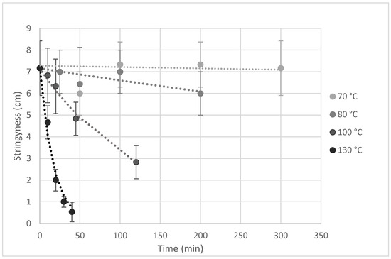 Experimental stringiness measurements (dots) during heat treatments at four temperatures. Error bars represent the standard deviation (n = 3) and lines represent the modeled data.