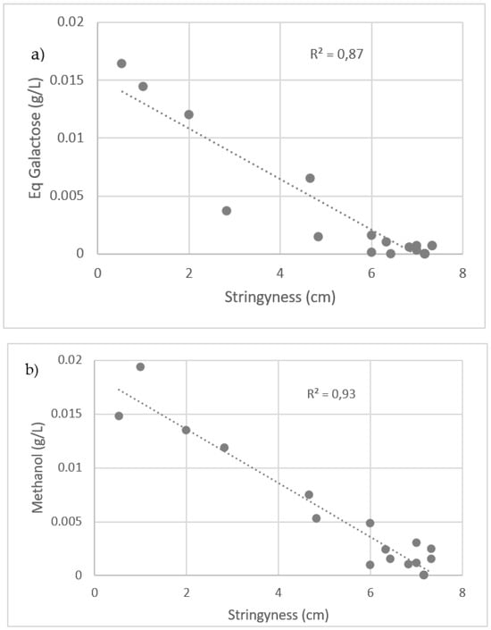 To confirm this hypothesis, all the data from the thermal treatments were pooled, and the methanol and reducing end sugar content was plotted against stringiness (Figure 6a,b). The determination coefficients were 0.87 and 0.93 for reducing end sugars and methanol content, respectively. Therefore, the concomitant evaluation of chemical indicators of pectin degradation in a model media and of texture loss in the real matrix show that those data were strongly correlated.