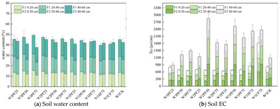 Characteristics of changes in mean soil water content and EC in the vertical direction under different organic fertilizer ratios and irrigation rates in 2023.