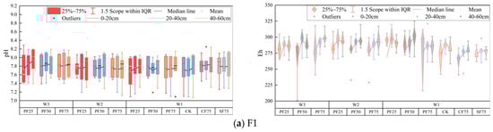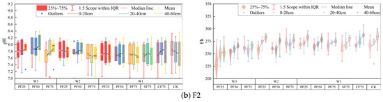 A repeated-measures ANOVA was conducted on the physical and chemical properties of the soil at different time points during the growth period, as shown in Figure 2, Figure 3, Figure 4 and Figure 5. According to Supplementary Materials Tables S1 and S2, in lightly and moderately salinized farmlands, soil moisture and salinity at a depth of 0–60 cm showed a trend of W3 > W2 for lightly salinized soil and W2 > W3 for moderately salinized soil. The soil pH values in lightly and moderately saline–alkali soils varied with the amount of irrigation, showing a trend of W3 > W2 > W1, and with different proportions of organic fertilizer, displaying a trend of 75% > 50% > 25%. Supplemental irrigation at 44 mm increased soil reducibility by 0.7% and 6.3% in lightly and moderately saline–alkali soils, respectively, whereas irrigation at 22 mm increased soil oxidizability by 0.9% in lightly saline–alkali soil and reducibility by 1.1% in moderately saline–alkali soil.