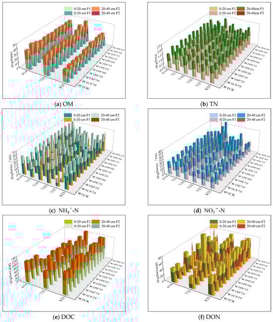 In the lightly saline–alkali soil, the soil organic matter (OM) content showed a trend of W1 > W2 > W3 with different irrigation amounts, whereas total nitrogen (TN) showed a trend of W2 > W1 > W3. For the 0–40 cm soil depth, under different proportions of organic fertilizer application, the OM values were the highest at 25%, followed by 50% and 75%, whereas the TN values were the highest at 25%, followed by 75% and 50%. In the moderately saline–alkali soil, the OM and total nitrogen (TN) content showed a trend of W3 > W2 > W1 with different irrigation amounts. For the 0–40 cm soil depth under different proportions of organic fertilizer, the OM values were the highest at 25%, followed by 75% and 50%, whereas the TN values were the highest at 25%, followed by 50% and 75%. In the lightly saline–alkali soil, supplemental irrigation reduced the soil content by 2.2–14.7% and increased the content by 3.2–15% in the 0–40 cm soil depth. For the 0–40 cm soil depth under different proportions of organic and inorganic fertilizer application, the content was highest at 25% organic fertilizer proportion, followed by 75% and 50%, whereas the content was highest at 75%, followed by 50% and 25%. In the moderately saline–alkali soil, supplemental irrigation increased the soil and content by 6.5–27.6% and 15.8–24.7%, respectively, at the 0–40 cm soil depth. Among them, the and values were the highest at the 50% organic fertilizer proportion.