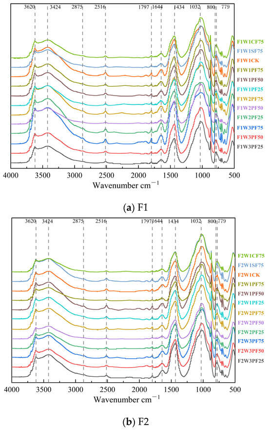 A commonly used molecular method for analyzing soil organic matter components is Fourier-transform infrared (FTIR) spectroscopy, which can identify functional groups primarily derived from aliphatic carbon, aromatic carbon, and polysaccharide carbon [34]. Based on the existing literature, different characteristic regions of organic functional groups can be defined [35] as aliphatic carbons (2800–3010 cm−1), aromatic carbons (1580–1660 cm−1), polysaccharide carbons (1520–1546 cm−1), and alcohols/phenols (3620, 3448 cm−1) [36,37]. The infrared spectra of the soil samples were analyzed for characteristic peaks, and the corrected peak areas were calculated through integration. This approach allows for the quantitative assessment of the various functional groups present in soil organic matter, providing insights into its composition, stability, and potential for decomposition.