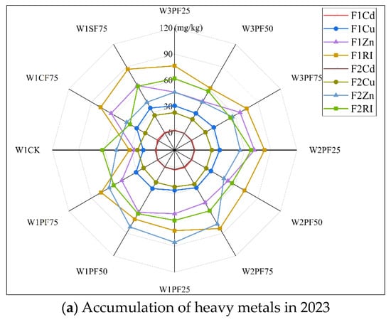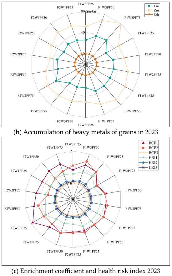 The primary factors influencing soil heavy metal accumulation and changes in heavy metal residues in grains were analyzed under varying ratios of organic fertilizer and irrigation water volumes. A PCA was conducted on soil heavy metal accumulation, grain heavy metal residues, and evaluation indicators, as shown in Figure 7. Based on the first PCA, F1 exhibited the pattern Cu > Zn > Cd, whereas F2 showed the pattern Cd > Cu > Zn. In the mildly saline–alkali soil, varying proportions of organic fertilizer and supplemental irrigation primarily affected the Cu and Zn residues in the crop grains and the accumulation of Cd in the surface soil during the grain-filling stage. A positive correlation was observed between the contents of the three heavy metals (Cu, Zn, and Cd) in the soil surface layer and among the heavy metal residues in the crop grains. Conversely, there was an inverse correlation between the heavy metals (Cu, Zn, and Cd) in the soil and their corresponding residues in the crop grains. In the moderately saline–alkali soil, the primary effects were similar to those in the mildly saline–alkali soil, affecting the residues of Cd and Cu in the crop grains and the accumulation of Cd in the surface soil during the grain-filling stage. A positive correlation was also evident among the three heavy metals in both the soil surface layer and crop grains, as well as between the heavy metals in the soil surface layer and their residues in the crop grains.