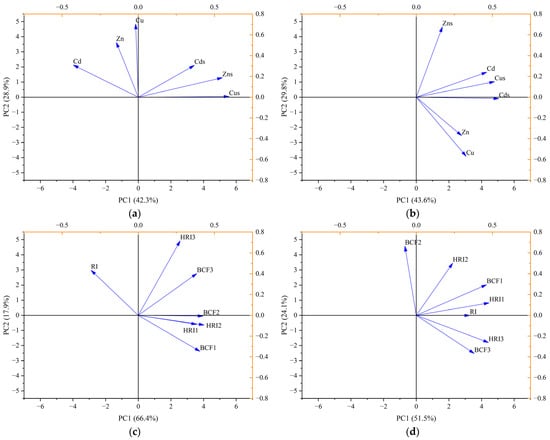 Principal component analysis. (a) F1 Heavy metal content in soil surface layer and crop grains. (b) F2 Heavy metal content in soil surface layer and crop grains. (c) F1 Ecological risk index, health risk index, and heavy metal enrichment coefficient. (d) F2 Ecological risk index, health risk index, and heavy metal enrichment coefficient.