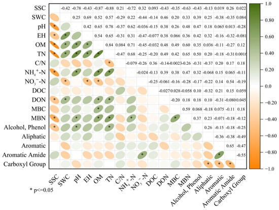 An analysis was conducted to explore the relationships between the basic chemical properties of the soil, soil nutrients, active fractions of organic carbon and nitrogen, organic carbon functional groups, heavy metal accumulation, and risk in soil and crop grains. Redundancy analysis was performed to eliminate highly correlated soil indicators. As shown in Figure 8, the soil salinity at 0–60 cm depth exhibited a significantly strong negative correlation with soil pH, organic matter, total nitrogen, and ammonium nitrogen. There was also a significant, moderately negative correlation between soluble nitrogen and microbial biomass nitrogen. Soil organic matter, total nitrogen, and ammonium nitrogen contents had a significantly strong positive correlation with soil pH and redox potential at the 0–60 cm depth. Among the active fractions of soil organic carbon and nitrogen, soluble nitrogen and microbial biomass nitrogen showed a significantly strong positive correlation with soil organic matter, total nitrogen content, and pH. Among the organic functional groups, carboxyl groups showed a significantly weak correlation with the aliphatics, aromatics, and aromatic amides, whereas the aromatic amides exhibited a significantly high positive correlation with the aromatic amines.