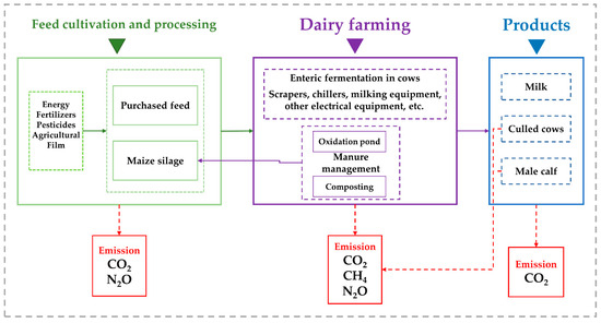 The IPCC methodology [8] was developed by the Intergovernmental Panel on Climate Change (IPCC) to guide the preparation of national GHG inventories. These guidelines offer assessment methods for various greenhouse gasses (GHGs), including carbon dioxide (CO2), methane (CH4), and nitrous oxide (N2O), categorized by different industries and sectors. The IPCC’s fundamental calculation methodology utilizes the emission factor method, where emissions are determined by multiplying activity data with emission factors. The methodology and default values of emission factors and parameters provided by the IPCC serve as important references for national and municipal GHG emission inventories, as well as for evaluating GHG emissions of enterprises and products. At the same time, the Guidelines for Preparation of Provincial GHG Inventories, developed by the Climate Department of the National Development and Reform Commission (NDRC), align with the IPCC’s accounting methodologies and are categorized by sectors and industries. These guidelines offer guidance for measuring carbon emissions and are deemed more suitable for conducting regional-level greenhouse gas accounting in China compared to global alternatives. On the contrary, livestock and poultry farming GHG emission models, such as the dairy gas emissions model (Dairy GEM), rely on systematic carbon balance and are utilized to assess GHG emissions from dairy farming.