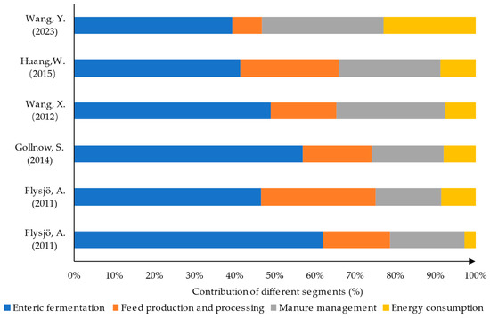 Figure 2 summarizes national and international studies on the contribution of different segments to the system, of which emissions from enteric fermentation contributed the most to the system, ranging from 46 to 62%; followed by feed production and processing, ranging from 14 to 34%; manure management, ranging from 11 to 33%; and dairy farm energy consumption, ranging from 4 to 18.9%. A comparison of the accounting results of this study with national and international studies shows that enteric fermentation in dairy cows in this study produced the highest carbon equivalent emissions of 5135.1 t CO2-eq, which accounted for 38.2% of the total emissions, slightly lower than the reported values (46%~62%) [17,18,19,20]. The emission equivalent of the manure management link is 3947.4 t CO2-eq, accounting for 29.4%. The emission equivalent of manure field consumption is relatively low, 491.2 t CO2-eq, accounting for 3.7% of the total emissions. For comparative analysis, the emissions from manure field consumption in this study were attributed to manure management emissions, which can be seen to be slightly higher than the reported 11–33%. The emission equivalent of the feed production and processing segment was 963.2 t CO2-eq, accounting for 7.2% of the total emissions. The emission equivalent of the energy consumption segment of the dairy farm was 2989.5 t CO2-eq, accounting for 22.3% of the total emissions, which is higher than the reported 4%~18.9%. The high energy consumption of this dairy farm is mainly because it is located in the cold region of the northeast, which requires more energy supply for warmth due to its special climatic conditions; and its electricity consumption includes the consumption of the production area and the on-farm living area, which is not exclusively a part of the consumption of the dairy cattle production.