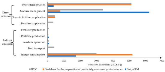 In accounting for GHG emissions from dairy farms, the three methods (IPCC Guidelines, Provincial Guidelines for the Preparation of Greenhouse Gas Inventories, and the Dairy GEM model) showed significant differences in the results of the assessment of enteric fermentation, manure management, and the energy consumption aspects of dairy farms (Figure 4). In the enteric fermentation segment, the CH4 emissions from the Dairy GEM showed a large difference in results compared to the other two methods, resulting in the lowest contribution. This difference was mainly attributed to the model developed by Mills et al. [22] used in Dairy GEM, which had built-in parameters and emission factors based mainly on data from Europe and the United States, which may not fully match the actual situation in Chinese dairy farms. The Dairy GEM had the highest contribution of CH4 emissions in the manure management segment, and the CH4 emissions from the Dairy GEM were mainly from the manure management segment because the Dairy GEM was process-based, developed an empirical equation for CH4 emissions related to ambient temperatures in the barn, and simulated methane emissions from the various manure treatment states. At the same time, the IPCC Guidelines provided a larger CH4 emission factor in this area than the provincial GHG inventory guidelines, which led to the difference in results from the Dairy GEM and the provincial GHG inventory guidelines. In the energy-consumption segment of dairy farms, the provincial GHG inventory compilation guideline had the highest contribution to emissions, mainly because it provided larger emission factors and covered fewer segments compared to the other two methods. To account for the carbon footprint more accurately, it was necessary to strengthen the acquisition of basic data based on the actual production situation of dairy farms in China.