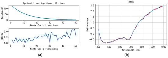 We set the number of Monte Carlo samples to 50 and used tenfold cross-validation to evaluate model performance and the effect of feature wavelength selection. The results showed that the CARS method significantly improved model performance, with the VSN-CARS model performing the best. After 11 iterations, the root mean square error of cross-validation (RMSECV) reached its lowest point, and 53 critical wavelengths were successfully selected, with the coefficient of determination Rp