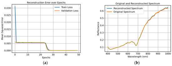 Figure 10b compares the reconstructed spectral reflectance curves of the SAE model with the original spectral curves, which overlap significantly, further confirming that the dimensionality-reduced features effectively retain and reflect the primary information of the original data.