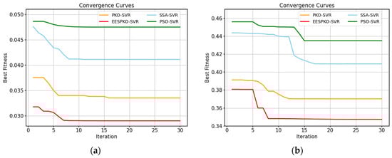 Despite its excellent predictive performance, SVR is highly sensitive to parameter settings, resulting in significant performance differences between configurations. To improve the model’s performance, we used the PSO, SSA, PKO, and EESPKO algorithms to optimize the key parameters , , and of the SVR model. The optimization strategy was based on minimizing the mean square error (MSE), with an initial population size of 20 and a maximum of 30 iterations. The search range for C and g was set in the range of [0.1, 100] and for in the range of [0.001, 0.1]. The final optimal combination of parameters was = 11.1038, = 3.6064, and = 0.001.