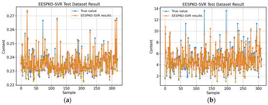 2 value of the VSN-SAE-EESPKO-SVR model on the test set reached 0.9516, which is an improvement of 4.13% compared to the base VSN-SAE-SVR model of 0.9139, showing a better fit. Meanwhile, this model’s RMSEP and MAE values are 0.1704 and 0.0974, respectively, 25.01% and 38.52% lower than the 0.2272 and 0.1584 of the base model, reflecting higher prediction accuracy. Compared to other optimization algorithms, the EESPKO model shows significant advantages in various vital indicators. Compared to the PSO algorithm, the RMSEP and MAE of EESPKO are reduced by 24.26% and 24.57%, respectively; compared to the SSA algorithm, they are reduced by 18.63% and 16.18%, respectively; and compared to the PKO, these two indicators are reduced by 9.61% and 9.81%, respectively. In addition, the RPD value of the EESPKO model is approximately 10% higher than that of PKO and more than 24% and 19% higher than that of PSO and the SSA, respectively. This shows that EESPKO not only significantly improves the prediction accuracy of the SVR model but also significantly enhances its robustness and generalizability.