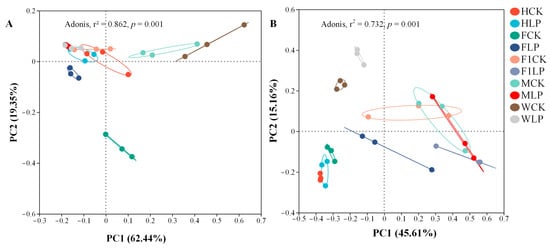 PCoA (principal co-ordinates) results based on OTU levels of the bacteria (A) and fungi (B) in the triticale silage (n = 3). PC1, principal co-ordinate 1; PC2, principal co-ordinate 2; CK, group with same volume of distilled water added; LP, group with Lactiplantibacillus plantarum added; H, heading stage; F, flowering stage; F1, filling stage; M, milk-ripening stage; W, wax-ripening stage.