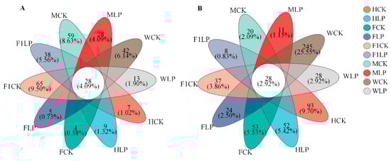 Petal chart of common and unique bacteria (A) and fungi (B) populations in the triticale silage at different harvest maturity stages. Different colors represent different treatments, with petals representing the number of species unique to the corresponding treatment and the center representing the number of species common to all treatments. CK, group with the same volume of distilled water added; LP, group with Lactiplantibacillus plantarum added; H, heading stage; F, flowering stage; F1, filling stage; M, milk-ripening stage; W, wax-ripening stage.