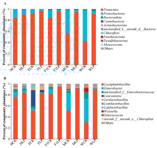 Relative abundances of the bacterial community proportions at the phylum (A) and genus (B) levels and in the triticale silage at different harvesting stages. HCK, control (CK) in the heading period; HLP, Lactiplantibacillus plantarum (LP) added in the heading period; FCK, CK in the flowering period; FLP, LP added in the flowering period; F1CK, CK in the filling period; F1LP, LP added in the filling period; MCK, CK in the milk-ripening period; MLP, LP added in the milk-ripening period; WCK, CK in the wax-ripening period; WLP, LP added in the wax-ripening period.