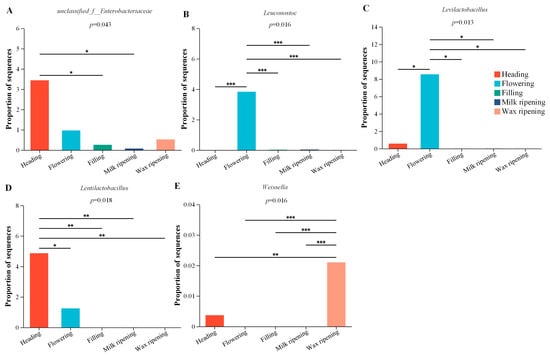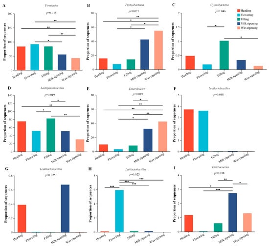 The different bacterial species of the triticale silage at the genus (among the top 10 bacterial genera) level during the different harvest maturity stages of the LP group. * means 0.01 < p ≤ 0.05, ** means 0.001 < p ≤ 0.01, *** means p ≤ 0.001.