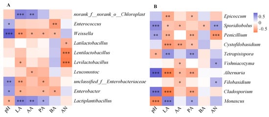 Spearman correlation heatmaps for the fermentation characteristics with the top 10 enriched bacteria (A) and fungi (B) at the genus level. Positive correlations are shown in purple and negative correlations are shown in orange. * means 0.01 < p ≤ 0.05, ** means 0.001 < p ≤ 0.01, *** means p ≤ 0.001.