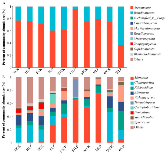 Relative abundances of fungal community proportions at the phylum (A) and genus (B) levels and in triticale silage at different harvesting stages. HCK, control (CK) in the heading period; HLP, Lactiplantibacillus plantarum (LP) added in the heading period; FCK, CK in the flowering period; FLP, LP added in the flowering period; F1CK, CK in the filling period; F1LP, LP added in the filling period; MCK, CK in the milk-ripening period; MLP, LP added in the milk-ripening period; WCK, CK in the wax-ripening period; WLP, LP added in the wax-ripening period.