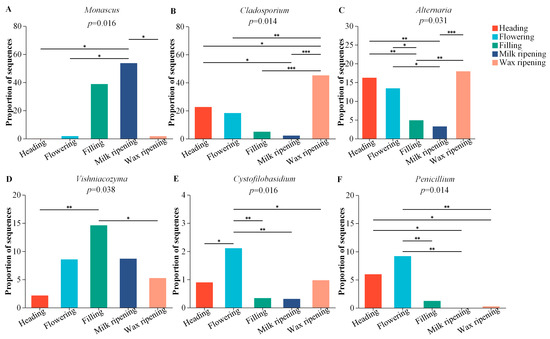 At the genus level, the most abundant fungal flora were Monascus, Cladosporium, Filobasidium, Vishniacozyma, and Tetrapisispora (Figure 7B). The most common fungal communities during the heading and wax-ripening stage, as well as those in the CK group during the flowering stage, were Cladosporium and Alternaria, which represented more than 14% and 12%, respectively (Supplementary Tables S6 and S7). During the filling and milking stages, as well as in the LP group during the flowering stage, the fungal genus with the greatest abundance was Monascus, which exceeded 27% (Supplementary Tables S6 and S7). The abundance of Monascus in the milk-ripening stage was significantly higher than in the heading, flowering, and wax-ripening stages in the CK group (Figure 8A). In addition, the abundance of Monascus in the milk-ripening stage was significantly higher than in the heading and wax-ripening stages in the LP group and the abundance of Monascus in the filling stage was significantly higher than in the heading and wax-ripening stages in the LP group (Figure 9C). Additionally, after inoculating with the LP, the abundance of Monascus increased, but no significant difference was found between the CK and LP groups during all the harvest maturity stages (Supplementary Table S8). During the wax-ripening stage, Cladosporium and Filobasidium were the fungal genera with the greatest abundances and they displayed significant differences during the harvest maturity stages, no matter whether they were with or without LP (Figure 8B,C and Figure 9D,F). There was no difference in the fungi genera between the CK and LP groups at each harvest maturity stage (Supplementary Table S8).