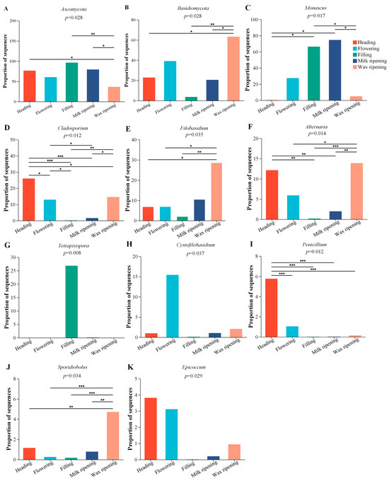 The different fungal species of the triticale silage at the phylum (no different fungal species were found) and genus (among the top 10 bacterial genera) level during the different harvest maturity stages of the CK group. * means 0.01 < p ≤ 0.05, ** means 0.001 < p ≤ 0.01, *** means p ≤ 0.001.