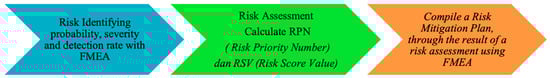 Figure 3 shows the stages carried out by previous researchers, based on previous research conducted by [46,47,48,49], regarding the stages of supply chain risk mitigation. Likewise, research by [50] used the FMEA method to look at quantitative risk assessment for passive building projects carried out by calculating the risk priority number (RPN) as a source of information used to make decisions in the risk management process. Research by [51] also used FMEA by using the proposed FMEA scale table for the frequency of occurrence, severity of effect, and detectability of risk factors in the passive building process. They took advantage of the FMEA scales developed by Ford Motor Company (1988) and FMEA scales specific to civil engineering projects. Research by [52] was conducted on the reliability and risk assessment of solar photovoltaic panels using failure mode effect analysis (FMEA).
