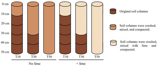 The following six treatments were established: (1) The crushed and mixed soil column of 0–10 cm was placed in the upper 0–10 cm, connected to original soil columns of >10–50 cm soil layer below, which simulated a tillage depth of 10 cm (T10), (2) the crushed and mixed soil column of 0–30 cm was placed in the upper 0–30 cm, connected to original soil columns of >30–50 cm soil layer below, which simulated a tillage depth of 30 cm (T30) (3) the crushed and mixed 0–50 cm soil column was placed in the 0–50 cm soil layer, which simulated a tillage depth of 50 cm (T50), (4) the crushed 0–10 cm soil column was mixed with lime and placed in the upper 0–10 cm, connected to original soil columns of >10–50 cm soil layer below, which simulated tillage depth of 10 cm with lime application (T10+Lime), (5) the crushed 0–30 cm soil column was mixed with lime and placed in the upper 0–30 cm, connected to original soil columns of >30–50 cm soil layer below, which simulated tillage depth of 30 cm with lime application (T30+Lime), and (6) the crushed 0–50 cm soil column was mixed with lime and placed in the 0–50 cm, which simulated tillage depth of 50 cm with lime application (T50+Lime).