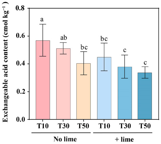 The soil exchangeable acid content of 0–20 cm soil depth at the end of the incubation period. The differences in soil exchangeable acid content among the different treatments were determined by Duncan’s test. Different small letters indicate significant differences at the level of p < 0.05. T10, tillage depth 10 cm; T30, tillage depth 30 cm; T50, tillage depth 50 cm; T10+Lime, T10 plus lime; T30+Lime, T30 plus lime; T50+Lime, T50 plus lime.