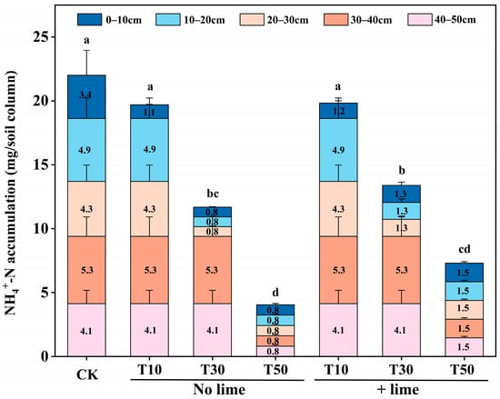 The accumulated levels of NH4+-N across 0–50 cm soil depth at the end of the incubation period. The differences of accumulation levels among the different treatments were determined by Duncan’s test. Different small letters indicate significant differences at the level of p < 0.05. CK, initial content; T10, tillage depth 10 cm; T30, tillage depth 30 cm; T50, tillage depth 50 cm; T10+Lime, T10 plus lime; T30+Lime, T30 plus lime; T50+Lime, T50 plus lime.