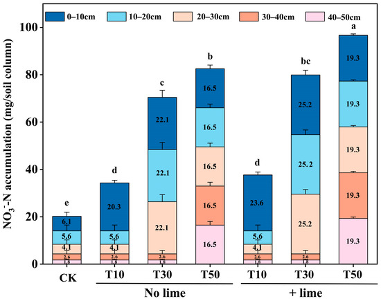 The accumulated levels of NO3--N across 0–50 cm soil depth at the end of the incubation period. The differences of accumulation levels among the different treatments were determined by Duncan’s test. Different small letters indicate significant differences at the level of p < 0.05. CK, initial content; T10, tillage depth 10 cm; T30, tillage depth 30 cm; T50, tillage depth 50 cm; T10+Lime, T10 plus lime; T30+Lime, T30 plus lime; T50+Lime, T50 plus lime.